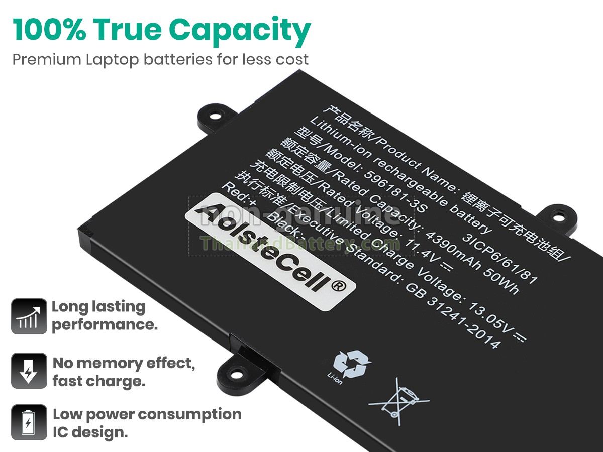 แบตเตอรี่ AolsteCell 596181-3S แต่ละชิ้นทำจากลิเธียมไอออนระดับ A+ คุณภาพสูง ซึ่งเป็นที่ดั้งเดิมจาก Samsung Panasonic และ LG ชิปวงจรอัจฉริยะ วัสดุสามารถทนต่ออุณหภูมิสูงและการสึกหรอ เปลือกแบตเตอรี่ ABS + PC วัสดุที่เป็นมิตรกับสิ่งแวดล้อม ประสิทธิภาพสูง รับรองความปลอดภัยด้วย