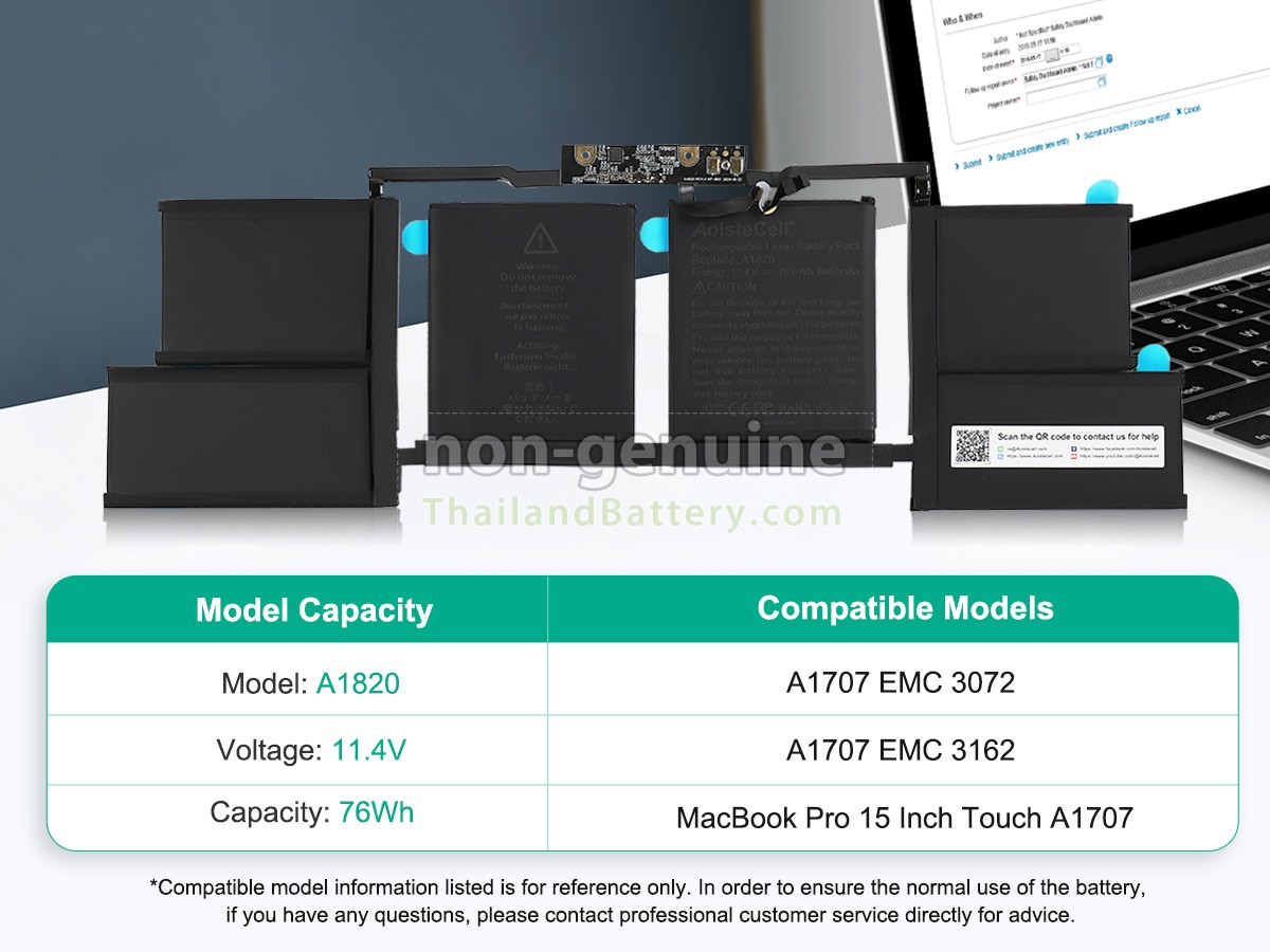 2 เปรียบเทียบแรงดันไฟฟ้าและความจุของแบตเตอรี่กับแบตเตอรี่ Apple MacBook Pro 15.4 inch TOUCH A1707(EMC 3072) ของเรา และตรวจสอบว่าอินเทอร์เฟซและรูปภาพของแบตเตอรี่เหมือนกันกับภาพในเว็บไซต์ของเราหรือไม่