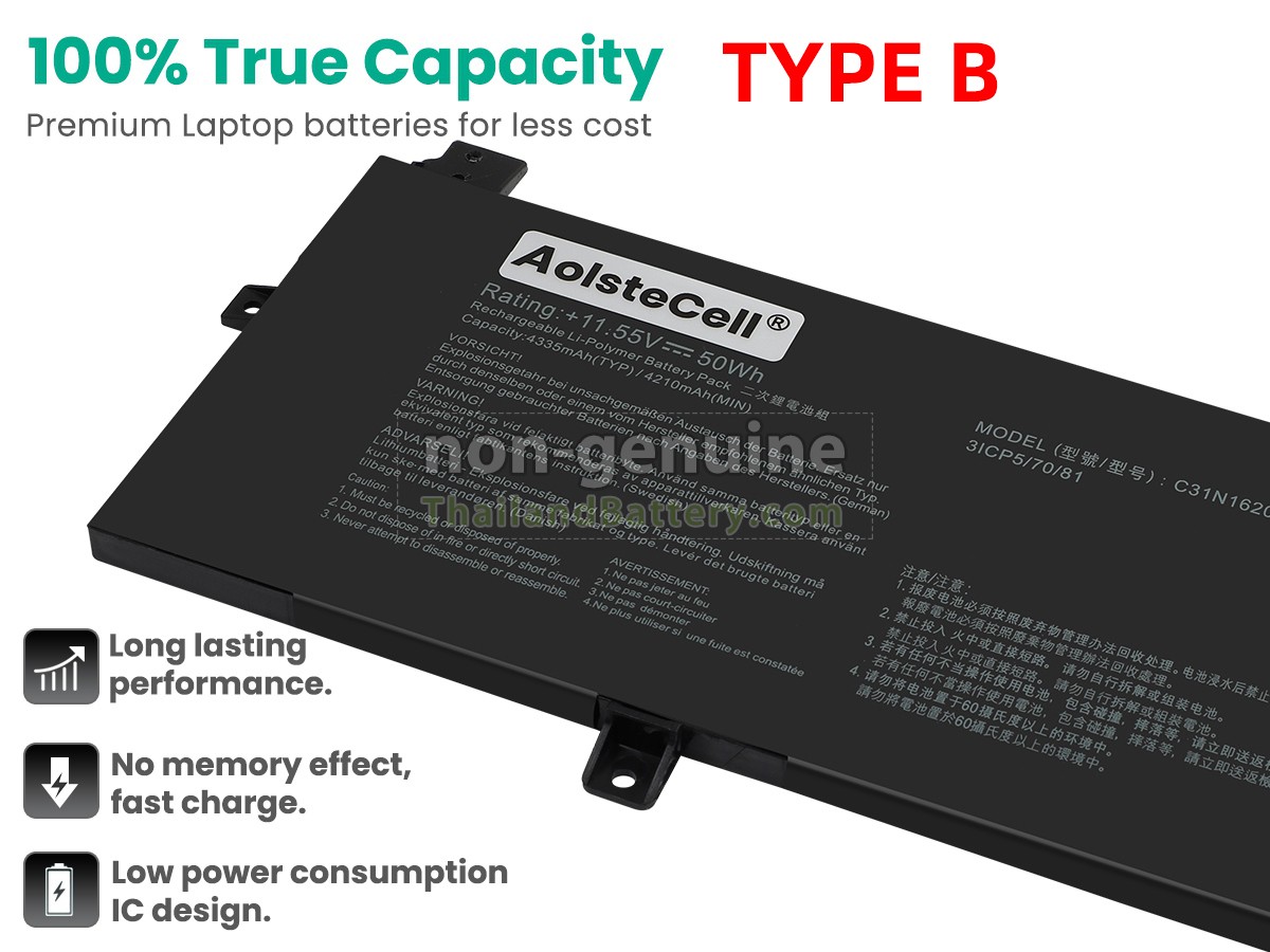 There are 2 types battery (Type A and Type B are incompatible), please open your laptop to check your old battery's connector position (on left or on right) first before placing an order, ensure order one correct battery. If your laptop model is [ UX3400,UX430 ] please order this battery. 3 เซลล์ | 50Wh Asus C31POJ1