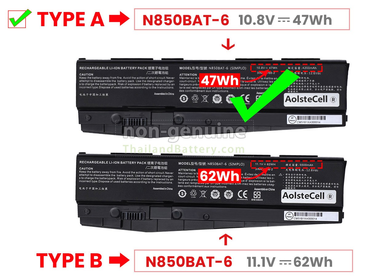Type A and Type B are fully compatible, the only difference is the capacity. Type B is a high-capacity battery. 6 เซลล์ | 62Wh Clevo N850BAT-6