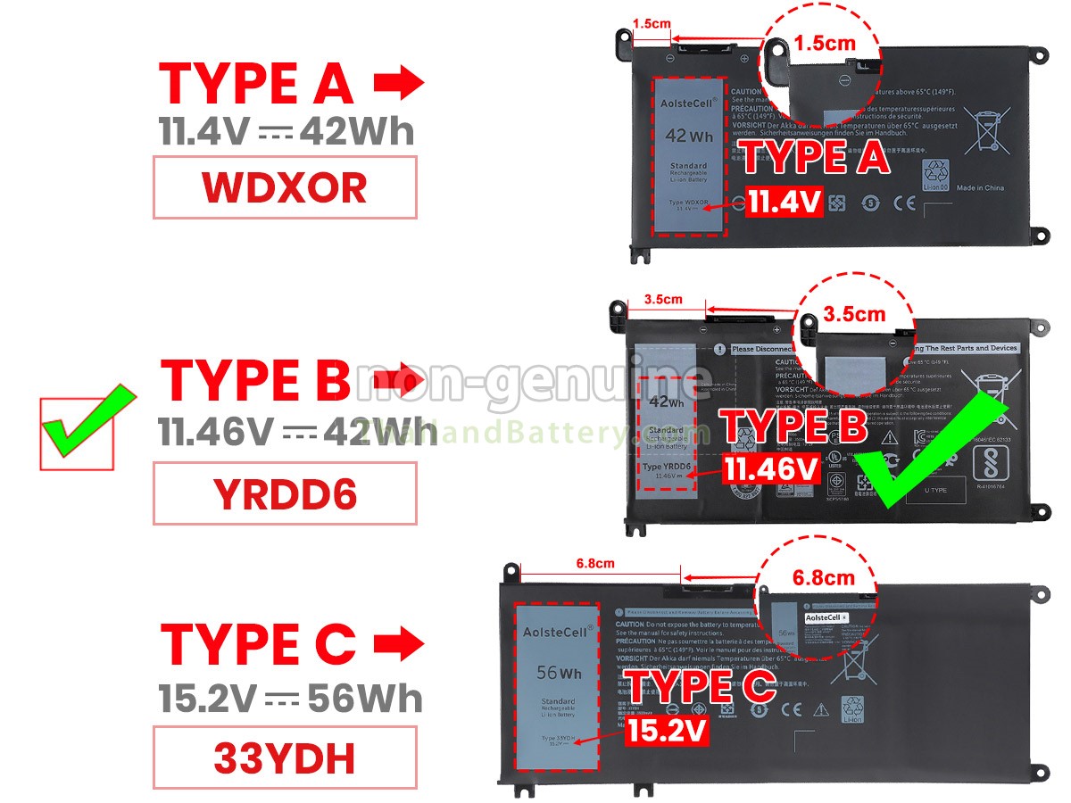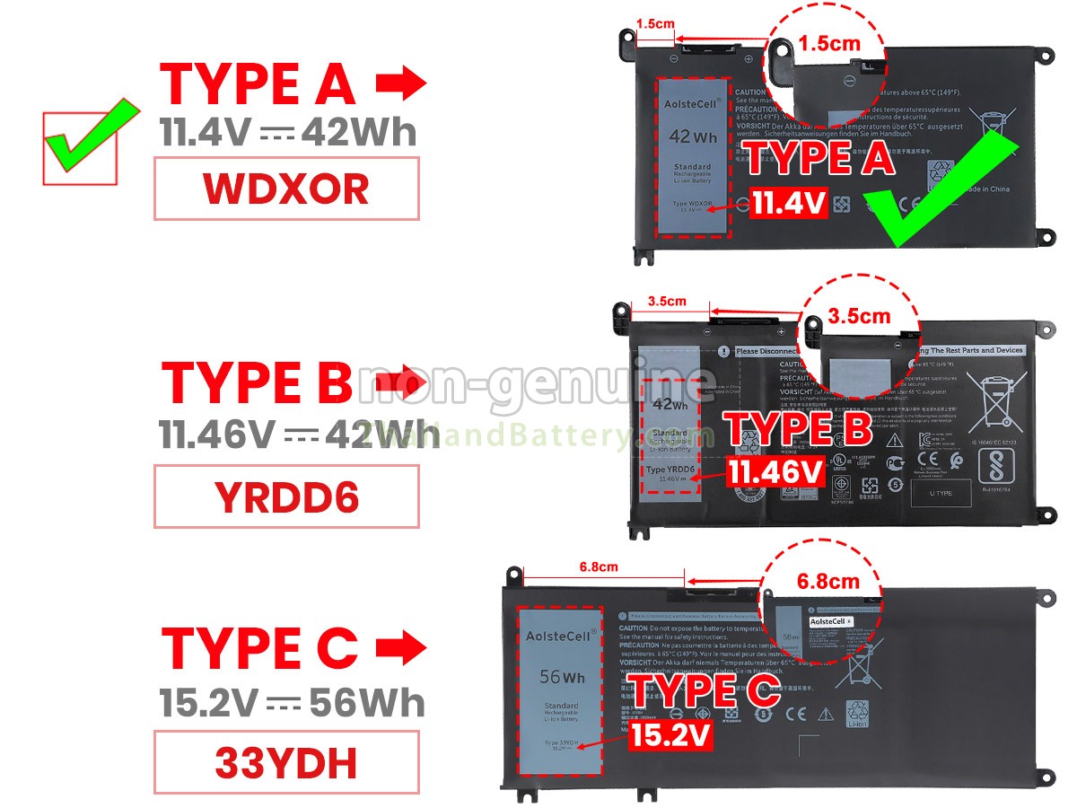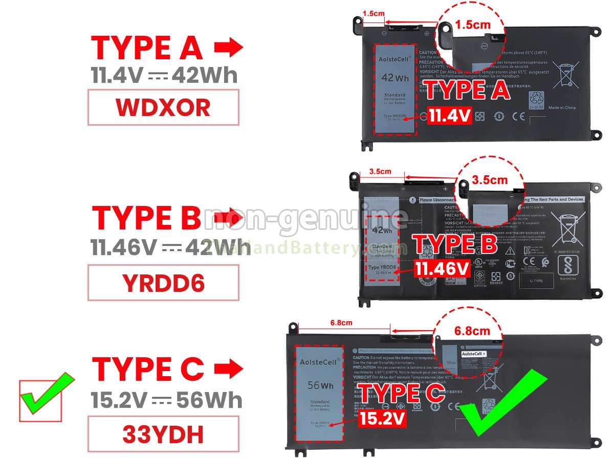 2 เปรียบเทียบแรงดันไฟฟ้าและความจุของแบตเตอรี่กับแบตเตอรี่ Dell Inspiron 13 7368 2-IN-1 ของเรา และตรวจสอบว่าอินเทอร์เฟซและรูปภาพของแบตเตอรี่เหมือนกันกับภาพในเว็บไซต์ของเราหรือไม่