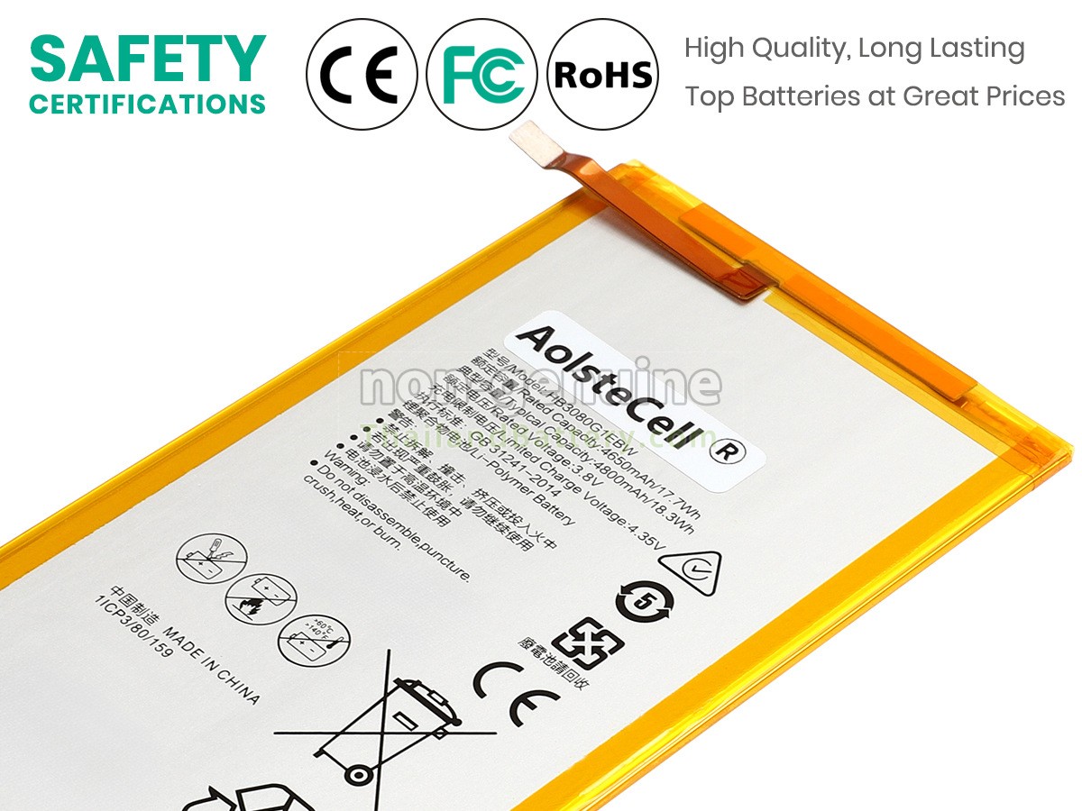 แบตเตอรี่ Huawei MEDIAPAD T3 10 ทั้งหมดได้ผ่านการรับรองความปลอดภัยจาก TISI CE และ UL ตามมาตรฐานสากล นอกจากนี้ ก่อนที่สินค้าออกจากโรงงานต้องผ่านการตรวจสอบอย่างเข้มงวดเพื่อปกป้องการใช้งานที่ปลอดภัยของท่าน!