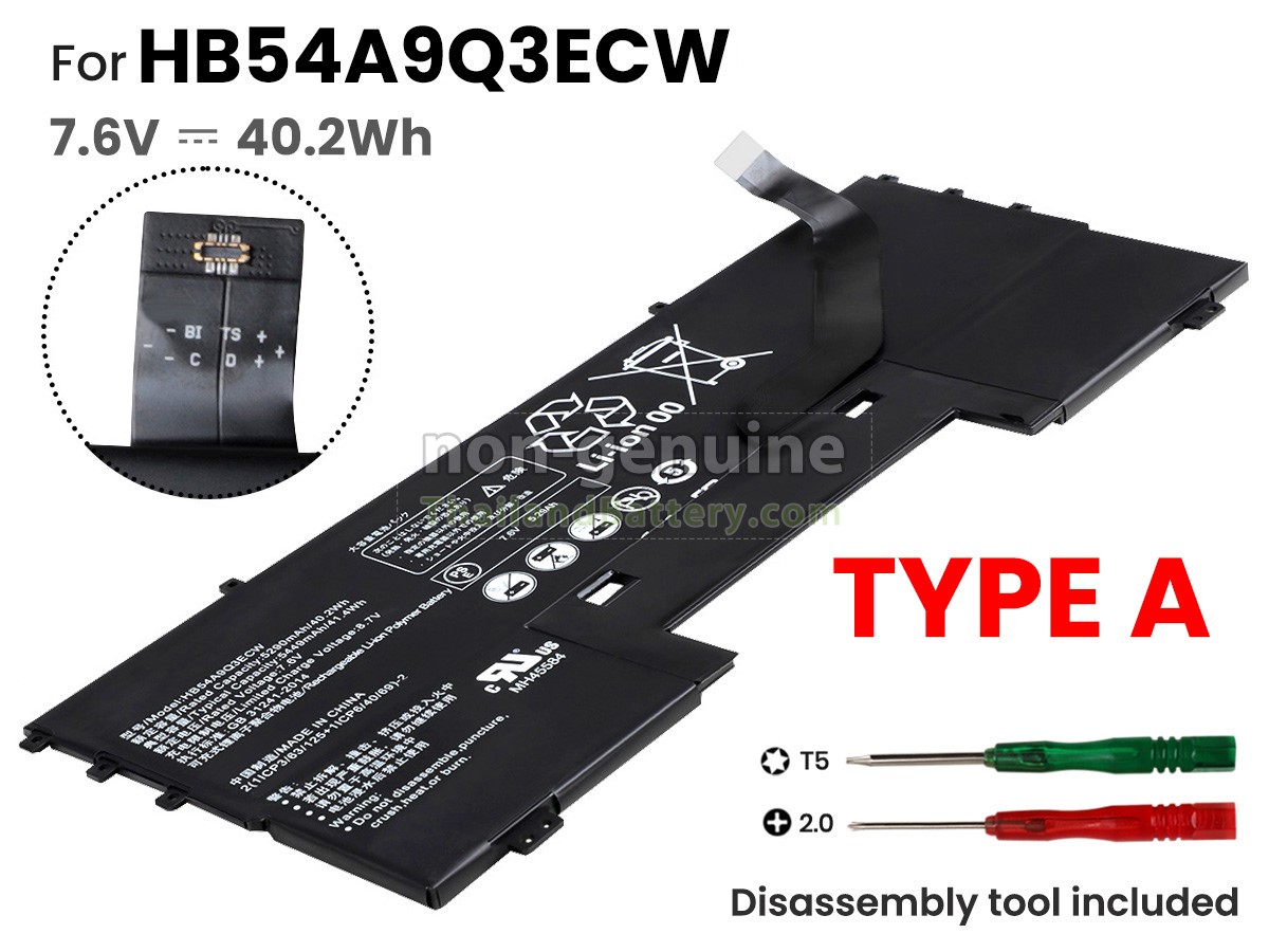 There are 3 types battery named "HB54A9Q3ECW", before placing an order please check your old battery first, ensure the connector is same to our battery Type A.