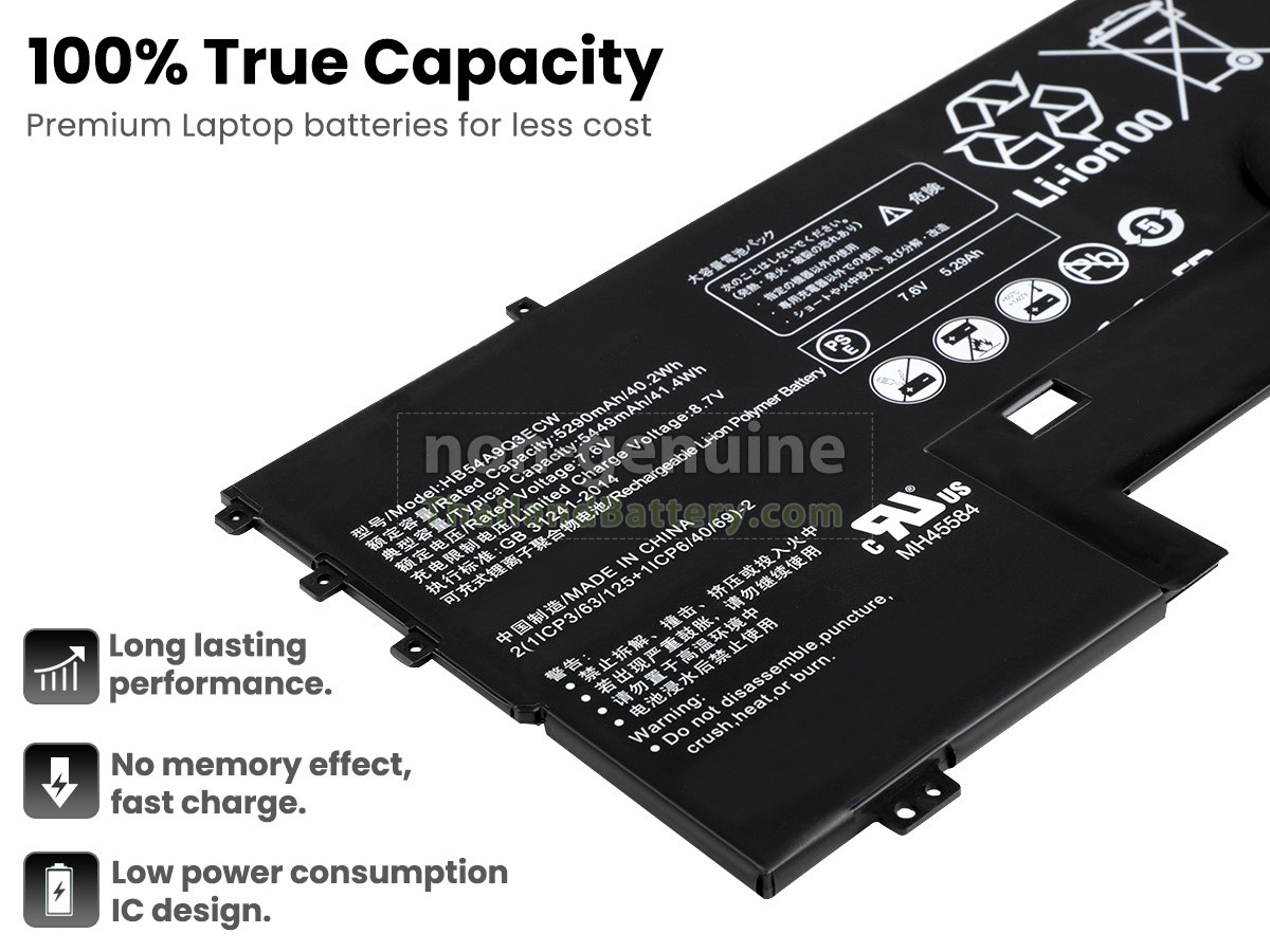 แบตเตอรี่ Huawei WT-W19 แต่ละชิ้นทำจากลิเธียมไอออนระดับ A+ คุณภาพสูง ซึ่งเป็นที่ดั้งเดิมจาก Samsung Panasonic และ LG ชิปวงจรอัจฉริยะ วัสดุสามารถทนต่ออุณหภูมิสูงและการสึกหรอ เปลือกแบตเตอรี่ ABS + PC วัสดุที่เป็นมิตรกับสิ่งแวดล้อม ประสิทธิภาพสูง รับรองความปลอดภัยด้วย