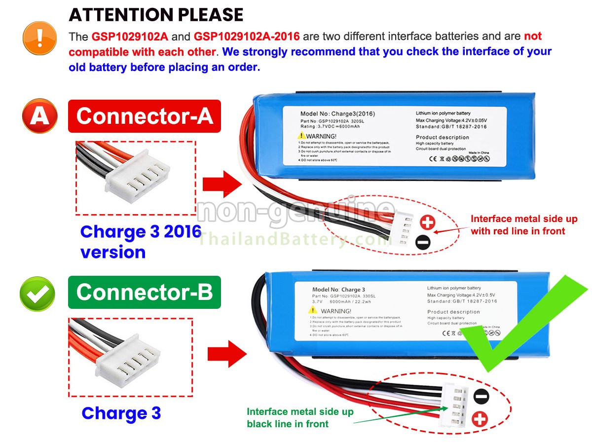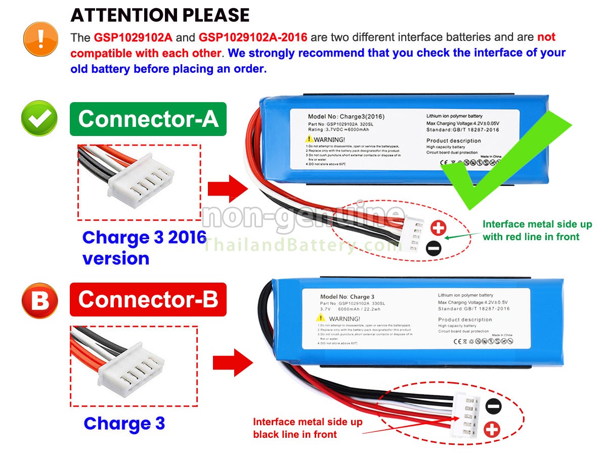 2 เปรียบเทียบแรงดันไฟฟ้าและความจุของแบตเตอรี่กับแบตเตอรี่ JBL CHARGE 3 2016 ของเรา และตรวจสอบว่าอินเทอร์เฟซและรูปภาพของแบตเตอรี่เหมือนกันกับภาพในเว็บไซต์ของเราหรือไม่