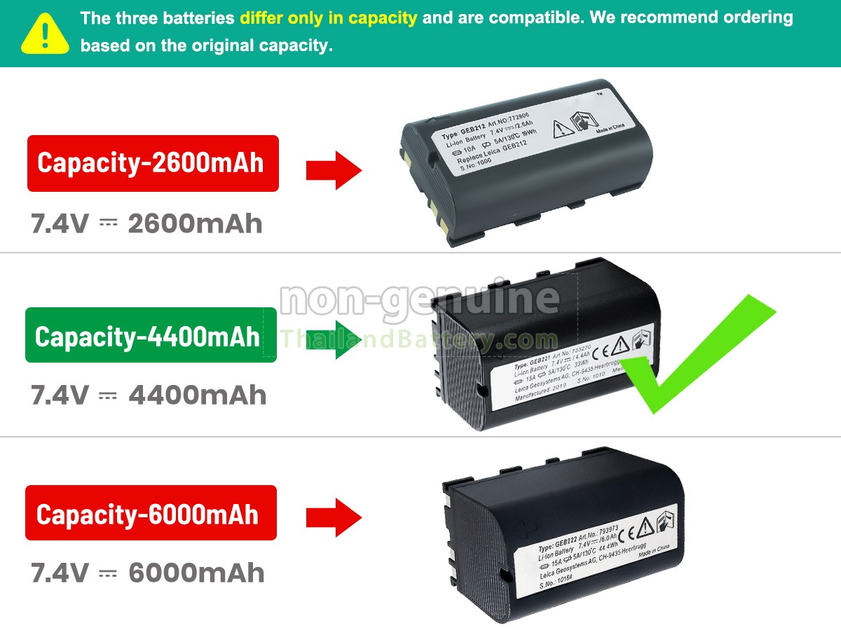 2 เปรียบเทียบแรงดันไฟฟ้าและความจุของแบตเตอรี่กับแบตเตอรี่ Leica ATX900 ของเรา และตรวจสอบว่าอินเทอร์เฟซและรูปภาพของแบตเตอรี่เหมือนกันกับภาพในเว็บไซต์ของเราหรือไม่