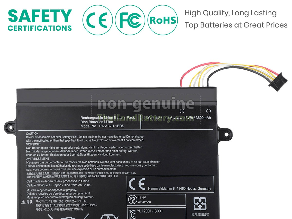 คำตอบ แบตเตอรี่ทั้งหมดที่ขายใน Thailandbattery.com เป็นแบตเตอรี่ของแท้ที่ทดแทนสำหรับ OEM เซลล์ดั้งเดิมและชิปอัจฉริยะที่เอฟเฟกต์การใช้งานเท่ากับแบตเตอรี่ดั้งเดิมหรือสูงกว่าแบตเตอรี่ดั้งเดิม ด้วยวิธีนี้ แบรนด์พรีเมี่ยมที่ราคาไม่แพงและคุณภาพดีๆ จริงๆแล้ว แบตเตอรี่ PA5098U-1BRS-T1 ดั้งเดิมนั้นประกอบด้วยอุปกรณ์เสริมของบุคคลที่สาม และติดเครื่องหมายแบรนด์ของตัวเองบนแบตเตอรี่เท่านั้น ที่ Thailandbattery.com ท่านสามารถซื้อผลิตภัณฑ์คุณภาพสูงด้วยราคาไม่แพง!